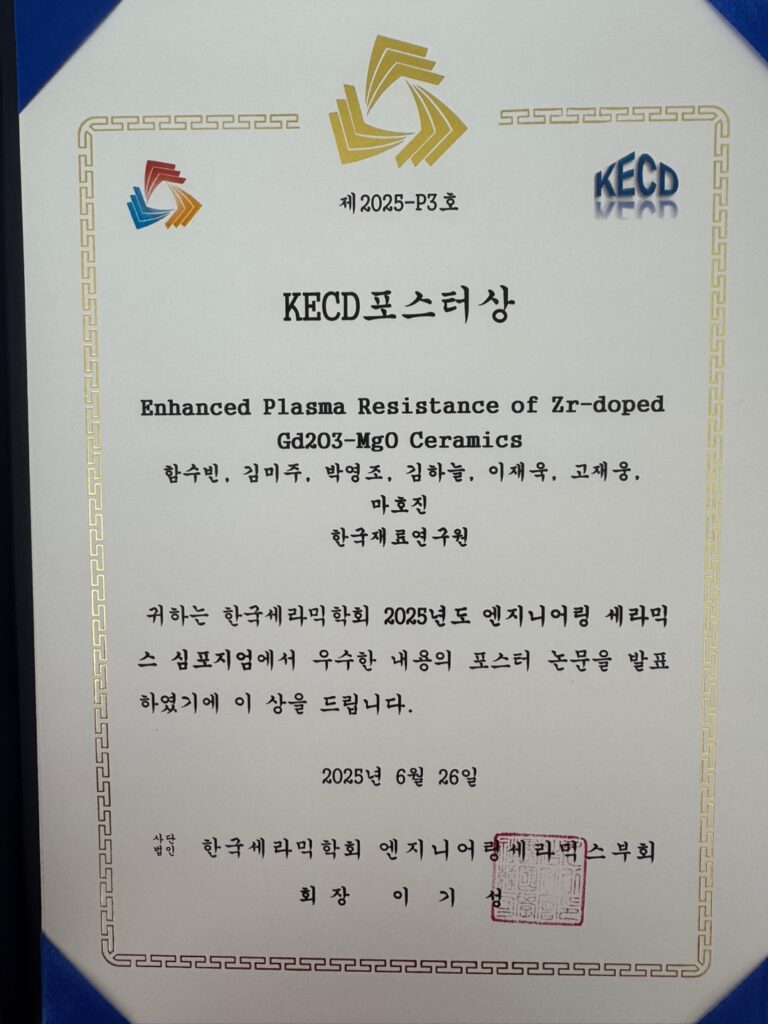 Su-Been Ham in our group received the KECD best poster award at the Korean Engineering Ceramics Division Meeting of the Korean Ceramic Society on June 26, 2025.