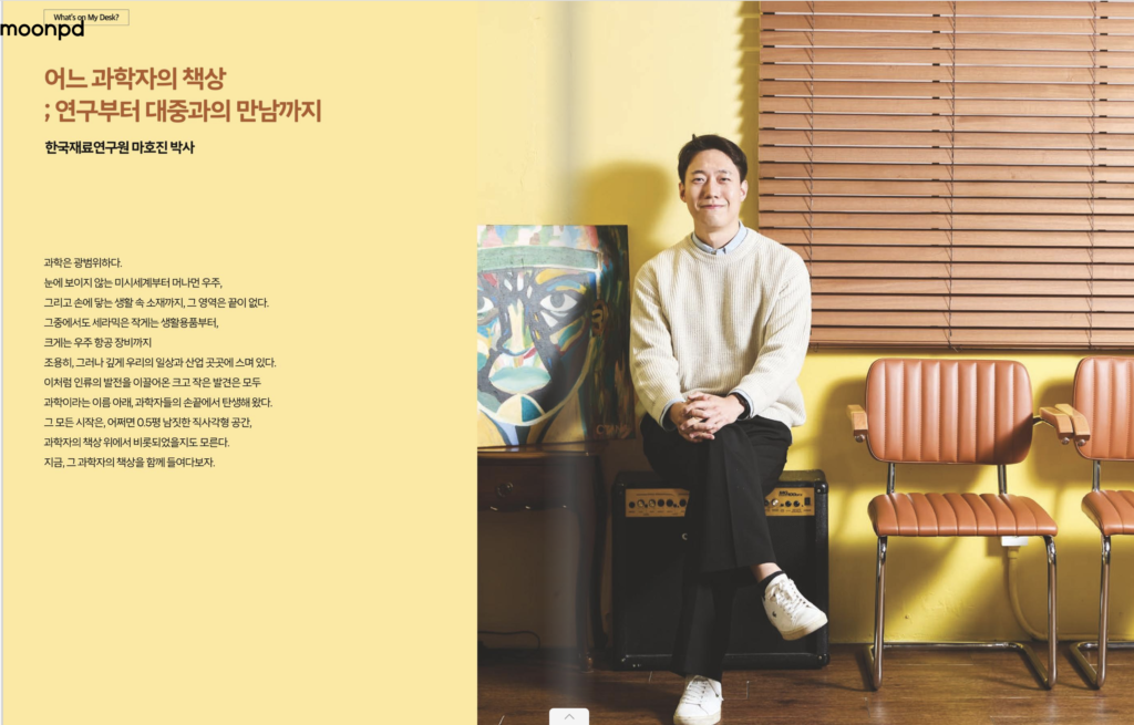 “과학은 광범위하다. 눈에 보이지 않는 미시세계부터 머나먼 우주, 그리고 손에 닿는 생활 속 소재까지, 그 영역은 끝이 없다. 그 중에서도 세라믹은 작게는 생활용품부터, 크게는 우주 항공 장비까지. 조용히, 그러나 깊게 우리의 일상과 산업 곳곳에 스며 있다. 이처럼 인류의 발전을 이끌어온 크고 작은 발견은 모두 과학이라는 이름 아래, 과학자들의 손끝에서 탄생해왔다. 그 모든 시작은, 어쩌만 0.5평 남짓한..”