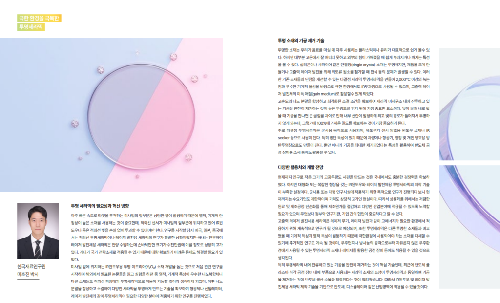 “The nose of a missile that rapidly tracks a target generates significant heat, so it’s crucial to use materials with high thermal and mechanical stability. Since the infrared sensor is located at the front of the missile, the IR window or dome must be able to transmit infrared light without any loss. When I first started this research, countries like the United States, Japan, and China were already actively studying infrared-transparent ceramics and laser gain media ceramics, but in Korea, no such research existed. All ceramics used for laser oscillators were imported, and even a palm-sized piece would cost tens of millions of won. Moreover, since these materials can be used as national strategic resources, it was also necessary to address the issue of securing them in large quantities.”